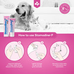 - Stomodine F, con aroma sintetico di carne per gatti e cani, facilita la somministrazione e l'adesione. Adatto a cani sensibili, applicare tra labbra e gengive con l'applicatore o il dito tra i pasti. Massaggiare delicatamente nelle gengive. Usare 1-2 volte al giorno per almeno 15 giorni e continuare secondo necessità. Ideale dopo procedure dentali per la manutenzione dentale continua.