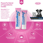 - Le proprietà ad azione rapida di Stomodine F contribuiscono a un'igiene orale migliorata per gatti e cani. Quando usato in modo coerente, può contribuire a ridurre la probabilità di problemi dentali e favorire la salute dentale complessiva.